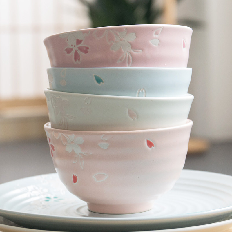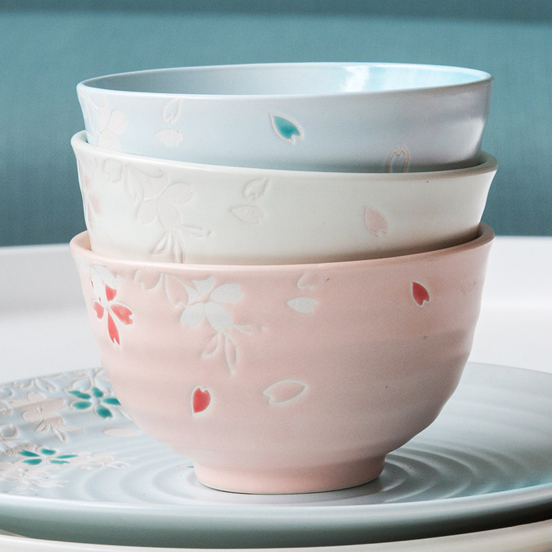 桜の花びらが優雅に舞う様子を立体的な浮彫で表現したご飯茶碗です。