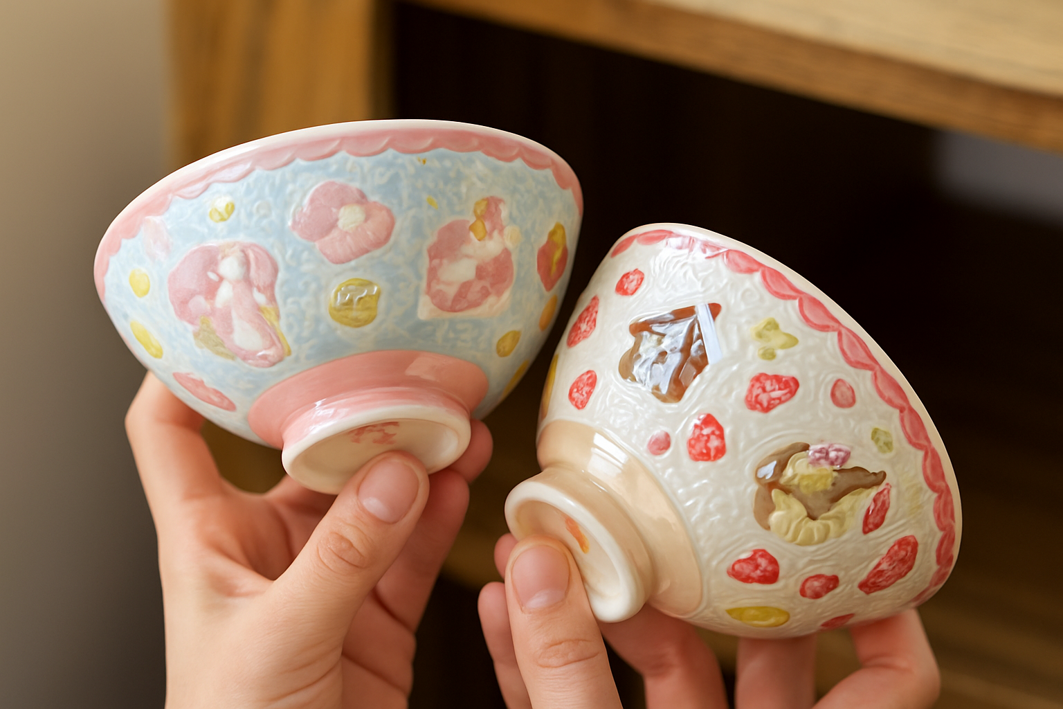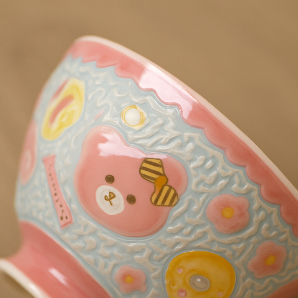 立体的な装飾が施された華やかな仕上がりで、毎日の食卓を明るく演出します。