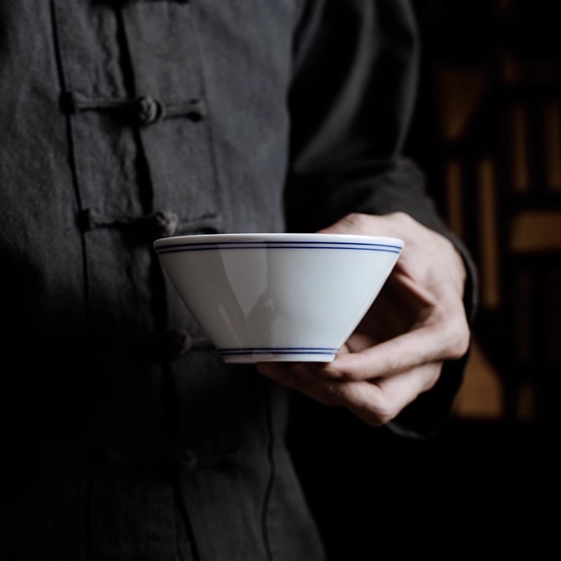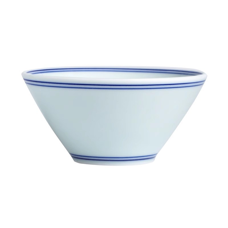 縁と底部に繊細な二本線が施された上品な磁器茶碗です。