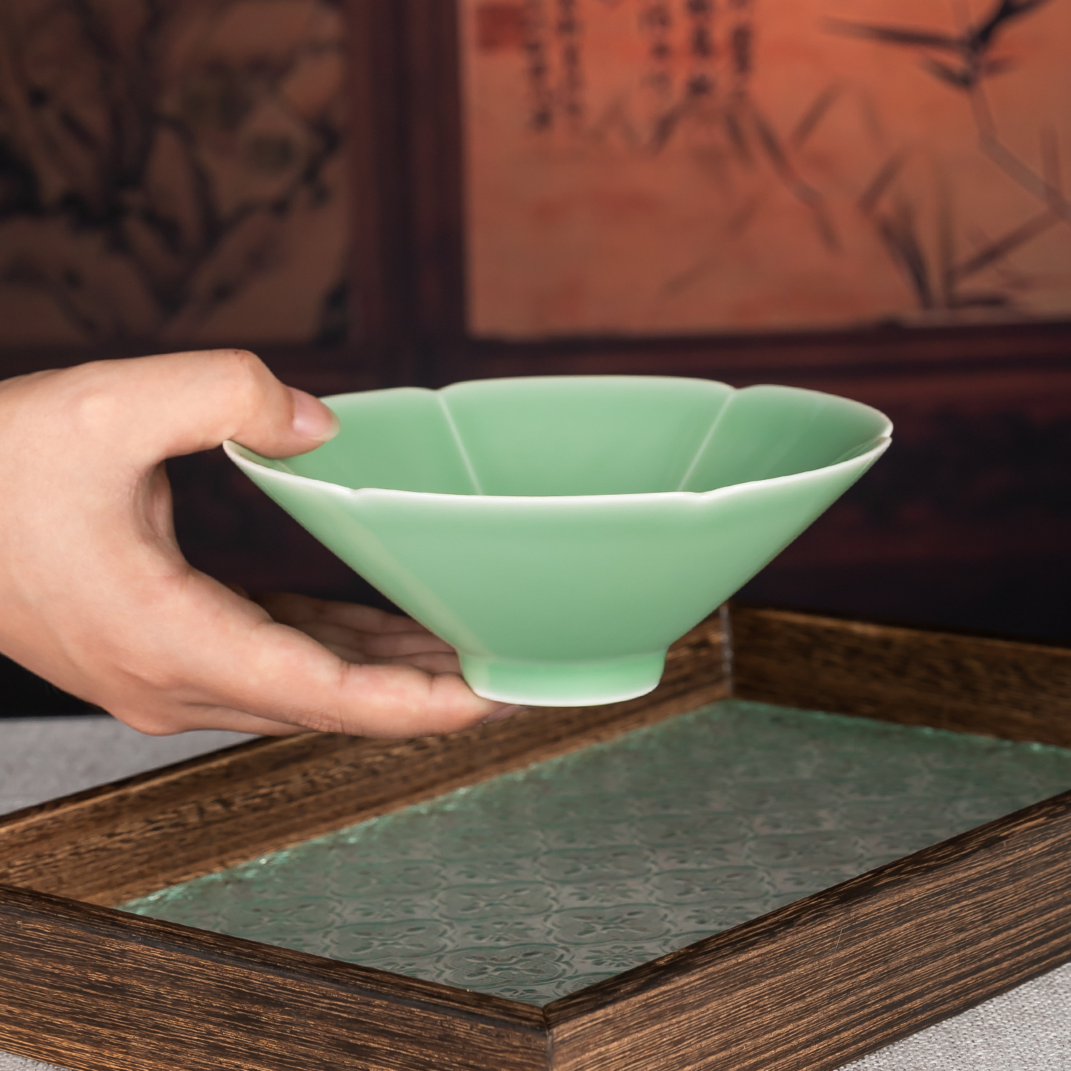 美しい花びらのような縁取りが特徴的な平茶碗です。